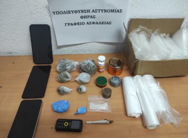 Κατασχέθηκαν 36,3 γραμμ. κάνναβης, 26,6 γραμμ. μεθαμφεταμίνης, μικροποσότητες κοκαΐνης, θρυμματιστές κ.α. Συνελήφθησαν χθες (Πέμπτη 24 Αυγούστου 2023) στη Θήρα,