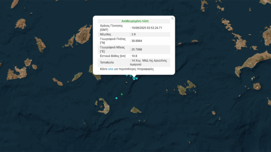 Σεισμός μεγέθους 3,9 βαθμών της κλίμακας Ρίχτερ σημειώθηκε στις 6:53 το πρωί της Δευτέρας 15/9 ανοιχτά της Αμοργού. Σύμφωνα με