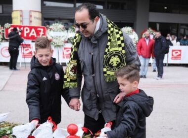 Συγκίνηση στο μνημόσυνο για τα θύματα της Θήρας 7 – Πατέρας με κασκόλ της ΑΕΚ και οι γιοί του κατέθεσαν λουλούδια